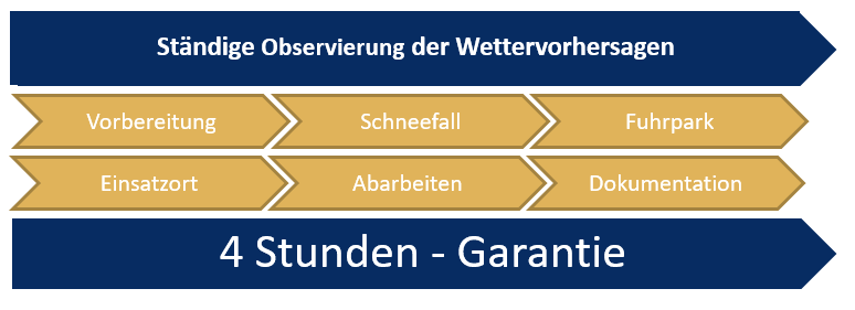 Gesetzlich vorgeschrieben ist eine zeitnahe Sicherung von Straßen und Gehwegen nach Schneefall. Um dieser Vorgabe nachzukommen stellen wir die Touren für unsere Mitarbeiter so zusammen, dass jede Tour innerhalb von maximal vier Stunden bearbeitet wird. Wir garantieren eine Abarbeitung der Touren mit einer Höchstdauer von maximal 4Std nach Schneefall, um gefährliche Unfälle und hieraus resultierende Haftungsverschulden zu minimieren.