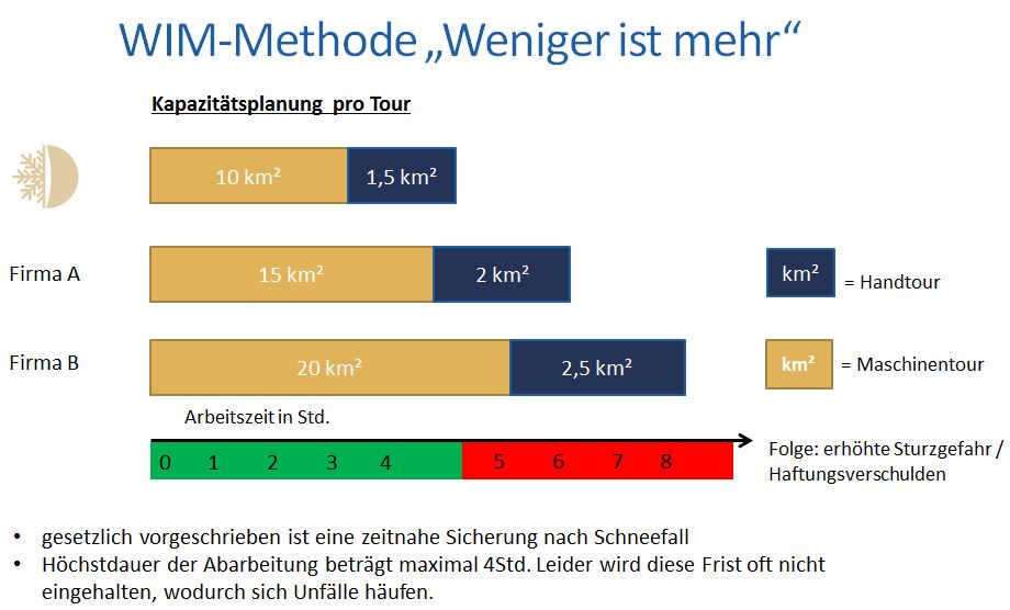 Festgelegte Touren für die Mitarbeiter mit bewährten Arbeitsabläufen für individuelle Kundenbedürfnisse sichern eine zuverlässige, fristgerechte und gründliche Räumung und Streuung gemäß dem Straßenreinigungsgesetzes. Dabei werden alle Reinigungsarbeiten in Einsatzberichten und Fotoaufnahmen dokumentiert und täglich an den Leiter übergeben. Bei der Ausführung setzen wir auf unsere bewährte WIM-Methode „Weniger Ist Mehr“ (siehe Ausführung).